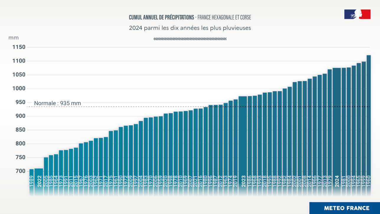 - 2024 figure parmi les dix années les plus pluvieuses à l’échelle nationale (+ 15 % par rapport à la normale) ;