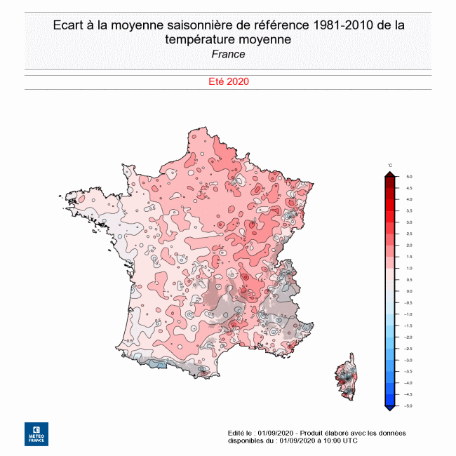 Les températures, assez fraîches jusqu’à mi-juillet hormis lors d’un pic de chaleur du 23 au 26 juin, ont ensuite été généralement supérieures aux normales. Lors des épisodes caniculaires, les maximales ont souvent atteint 6 à 12 °C de plus que les valeurs de saison sur une grande partie du pays, notamment sur le nord de l’Hexagone. Les températures ont été en moyenne proches des valeurs saisonnières, du Cotentin à la Bretagne, sur la façade atlantique, le long des Pyrénées ainsi que sur les Alpes. En revanche, elles ont été 1 à 2 °C au-dessus, de l’Occitanie, aux frontières du Nord et du Nord-Est. La température moyenne de 21 °C sur la France et sur la saison a été supérieure à la normale* de 1,1 °C, classant ainsi cet été au 7e rang des étés les plus chauds sur la période 1900-2020, toutefois très loin derrière l’été 2003 (+3,2 °C).