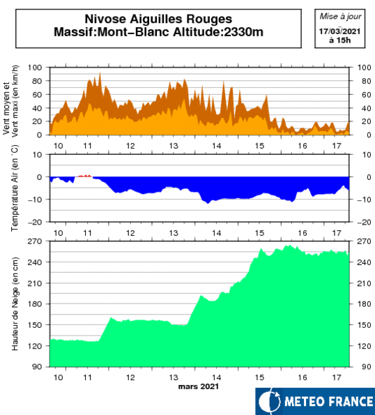 Entre le 13 au matin et le 17 mars au matin la plupart des postes de relevés, situés entre 1300 m et 2000 m d’altitude, ont mesuré en cumul près d’un mètre de neige supplémentaire. Aux Contamines-Monjoie (74), à 1780 m, le cumul a atteint 142 cm, avec 60 cm tombés entre dimanche et lundi matin.