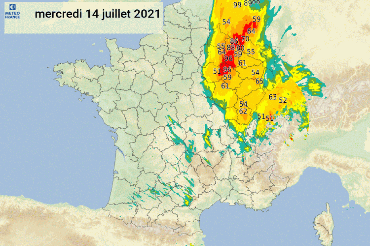 À ces cumuls, s'ajoutent aussi ceux de la veille (13 juillet) presque sur les mêmes zones géographiques :