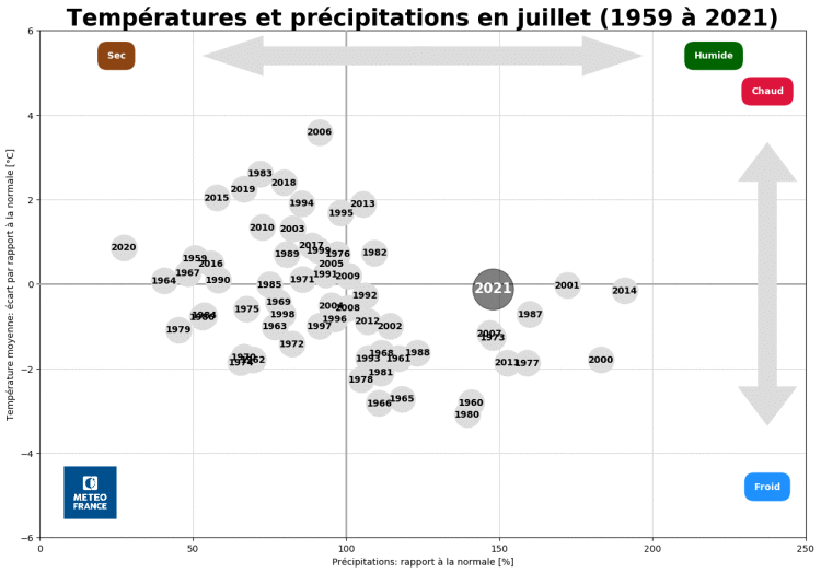 02/08/2021Le mois de juillet a été marqué par un temps assez maussade, faisant suite à un mois de juin déjà bien arrosé. Des perturbations actives se sont succédé sur la France dans une ambiance souvent fraîche, hormis du 17 au 23. Elles se sont accompagnées de précipitations très abondantes sur un large quart nord-est, notamment autour du 14 juillet. Par ailleurs, la tempête « Zyprian », exceptionnelle pour la saison, a touché la pointe bretonne et les côtes de la Manche les 5 et 6 avec des vents supérieurs à 100 km/h.