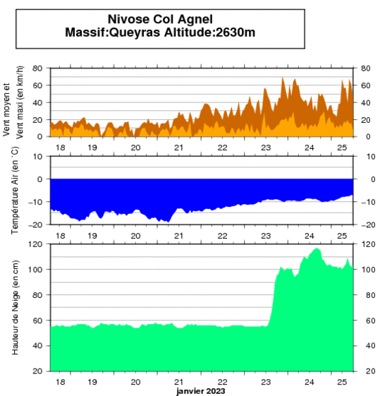 Les Alpes du Sud avaient connu un enneigement précoce avec des chutes de neige importantes jusqu’à basse altitude dès la fin décembre, mais avaient ensuite été plus épargnées par les perturbations et la neige avait commencé à sérieusement fondre sous le soleil. Le retour d’est du 23 au 25 janvier a permis de corriger cette tendance, en donnant, proche des crêtes frontières, jusqu’à 70 cm sur le Mercantour, 30 cm en Haute-Ubaye, et jusqu’à 60 cm en Haute-Maurienne. Ces chutes de neige ont permis de compenser l’absence de chute de neiges depuis décembre et l’enneigement est désormais conforme aux normales et même largement excédentaire sur l’est des massifs.