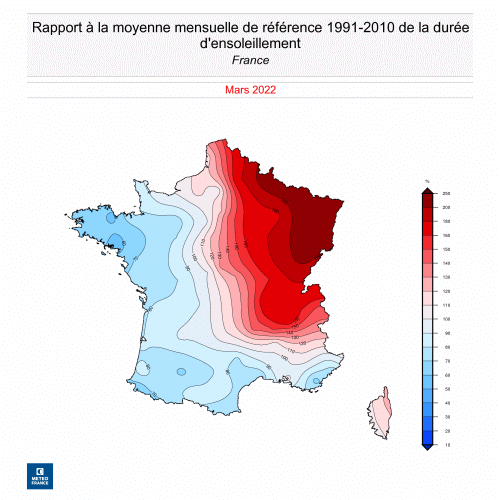 10/03/2022Depuis le début du mois de mars, l’anticyclone positionné sur l’Europe centrale protège efficacement les pays, de l’Allemagne au Benelux et la Suisse, ainsi que les régions françaises qui leur sont proches et où l’ensoleillement sur la 1re décade de mars atteint des niveaux remarquables, parfois plus du double de la normale avec des records battus sur cette période.