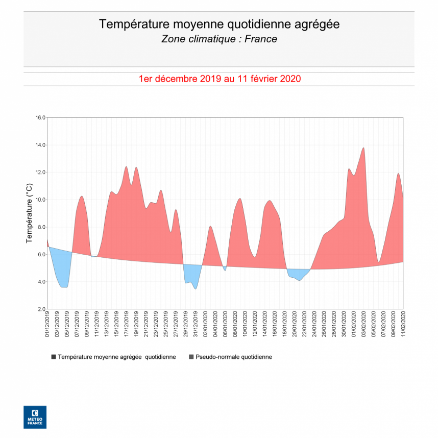 À 18 jours de la fin (puisque février comptera cette année 29 jours), l'hiver météorologique 2019-2020 est maintenant au coude à coude avec l'hiver précédemment le plus doux (2015-2016). Il terminera donc très probablement 1er ou 2e du classement, ceci d'autant plus qu'un fort pic de douceur est attendu en fin de semaine avec de nouveau un « Paris->Moscou » à plein régime. On pourrait alors connaître des minimales supérieures à 10 degrés jusqu'au nord de la Loire et des maximales dépassant les 20 degrés dans le Sud-Ouest. C'est d'ailleurs l'ensemble du continent qui connaît une saison atypique avec des bizarreries comme la situation du 11 février en début de journée. Une goutte froide s‘était alors isolée sur l'est de la Turquie provoquant des chutes de neige dans la région, jusqu'à la ville de Bagdad avec 4 centimètres relevés à la station (ce qui n'était pas arrivé depuis 2008). Il y avait alors plus de neige dans la capitale irakienne que dans les capitales de Fennoscandie (Oslo, Stockholm et Helsinki) où l'enneigement était nul (comme c'est le cas d'ailleurs à Helsinki ou Stockholm depuis le début de l'année, phénomène tout à fait hors norme). Les capitales scandinaves n'ont également pas connu une seule journée sans dégel depuis le 1er janvier.