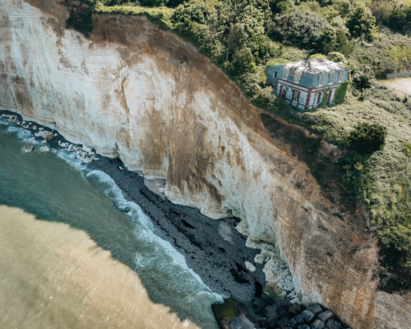 La légende du photographe : Vue aérienne d’une maison historiquement bourgeoise laissée à l'abandon, car vouée à s’effondrer face à l'inéluctable montée des eaux sur le littoral français, l'érosion de la côte et le recul du trait de côte. Des milliers de maisons sont ainsi concernées ...