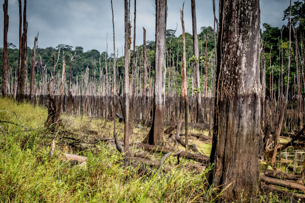 La légende du photographe : Les précipitations se font de plus en plus faibles en saison sèche, dans les régions tropicales comme la Guyane. Sur ce territoire, la force de l’eau est utilisée pour produire de l’énergie, grâce au barrage hydroélectrique de Petit-Saut. Ici, la forêt noyée du lac, et bien plus visible que d’habitude, en témoigne le marquage du niveau d’eau sur les troncs, datant de quelques jours. Ainsi le volume de l’eau du lac n’est plus assez conséquent pour faire tourner les turbines du barrage, ce qui risque à terme de priver de nombreuses personnes d’électricité. Le dérèglement climatique est aussi énergétique.