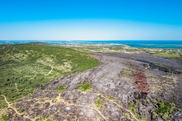 La légende du photographe : On pourrait croire à une coulée de lave figée qui a dévalé la pente pour redessiner le paysage. Pourtant, ici, sur les flancs du massif de la Gardiole, il n’y a pas de volcan. 5 juillet 2025, alors que la station météo voisine de Sète bat un record de chaleur, la Gardiole brûle.