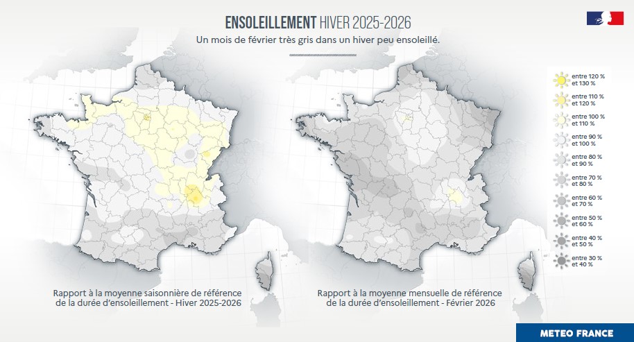 Après un mois de décembre 2025 plus ensoleillé que la normale (+10 %) et un mois de janvier 2026 proche de la normale, février 2026 affiche un net déficit d’ensoleillement (environ -20 %) malgré le retour du soleil en fin de mois. En février, l’ensoleillement a été déficitaire sur la quasi-totalité de l’Hexagone et la Corse. À l’échelle de l’hiver, l’ensoleillement est déficitaire d’environ 5 %.