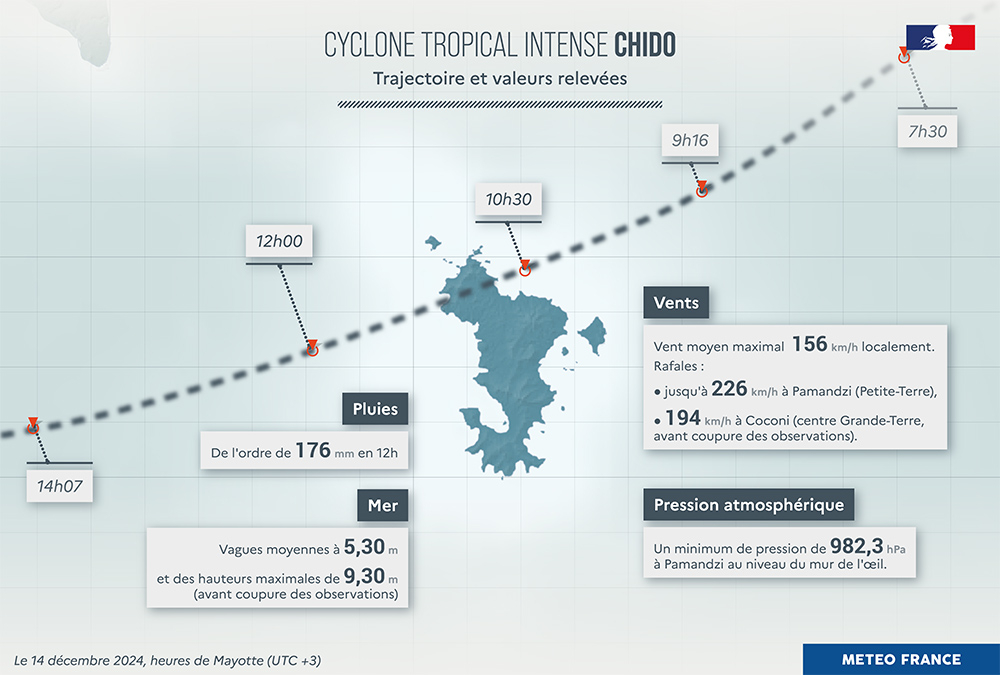Le cyclone intense Chido a traversé l’île de Mayotte, samedi 14 décembre, avec des vents dévastateurs. L’œil du cyclone a abordé le nord de la Grande-Terre vers 11 h, samedi, au niveau de la ville de Bandraboua pour ressortir environ 30 minutes après vers la ville d'Acoua sur la côte nord-ouest. Le mur de l’œil a concerné la Petite-Terre ainsi que les régions nord et centre de la Grande-Terre.