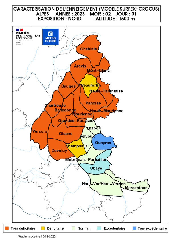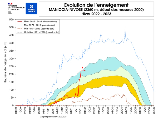 03/02/2023En ce début de février, la montagne est revêtue d’un beau manteau blanc. Depuis la mi-janvier les perturbations successives ont en effet déposé de la neige sur tous les massifs et même en abondance en Corse. L’enneigement s’est nettement amélioré partout. Il reste toutefois déficitaire pour cette période dans certains massifs selon les altitudes, notamment en dessous de 1800 m dans les Alpes du Nord, en altitude dans les Pyrénées, dans le Jura et sur les hauteurs des Vosges et du Massif central.