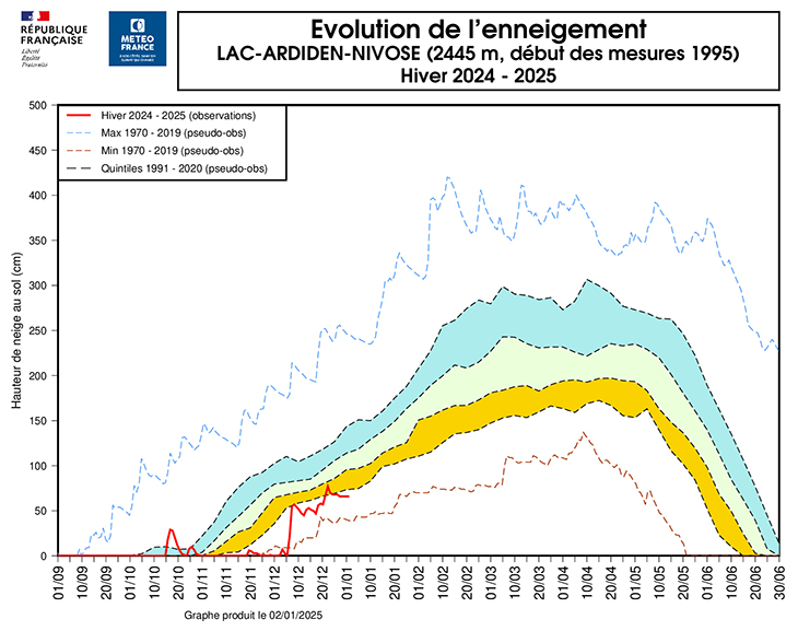 Dans les Pyrénées, le manteau neigeux s’est surtout constitué avec les chutes de neige liées aux tempêtes Darragh et Enol, autour du 8 et du 23 décembre. Les températures douces et la pluie du 24 au matin ont depuis réduit l’enneigement.