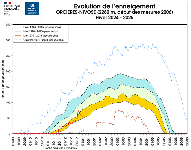 02/01/20252025 débute avec une couche de neige couvrant la moyenne montagne dans la plupart des massifs alpins. Depuis le 24 décembre, une période anticyclonique a diminué un bon enneigement dans les Alpes du Nord et les Hautes-Alpes. La plupart des Alpes du Sud et les Pyrénées présentent un faible enneigement.