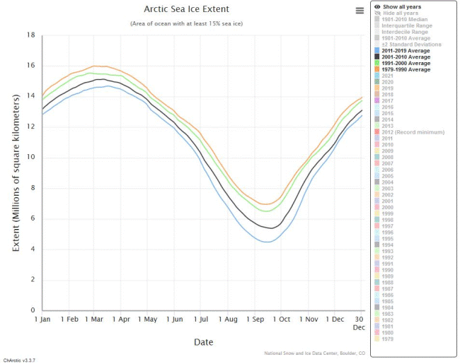 Extension de la banquise arctique. La courbe bleue correspond à l'année 2021 - © NSIDC