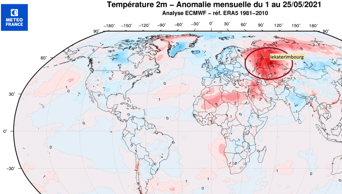 Notons que Iekaterinbourg est parti pour observer son mois de mai de loin le plus chaud depuis le début des mesures, battant de plus de 2 degrés le record de mai 1991, et ce, en tenant compte du rafraîchissement prévu cette dernière semaine de mai. Battre un record de température mensuelle de plus de 2 degrés serait très significatif. Il ne s’agit pas d’une valeur quotidienne ponctuelle, mais d’une moyenne sur 31 jours ! On voit aussi que, plus globalement, dès qu'on s'éloigne de la fraîcheur européenne, on tombe sur de très fortes anomalies chaudes ; des zones où des records sont tombés récemment (Caucase, Arctique NW russe, Oural, Kazakhstan).