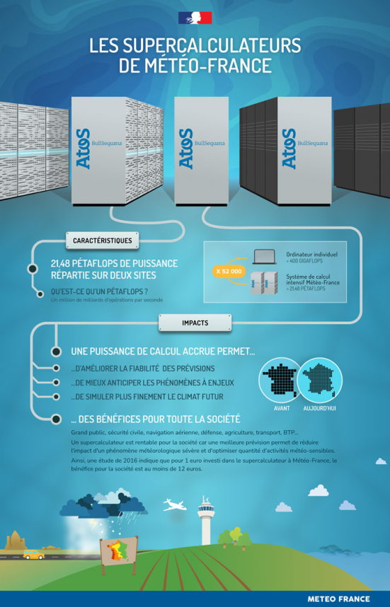 - ... D’améliorer la fiabilité des prévisions. Le supercalculateur permet d’améliorer la fiabilité et la qualité des prévisions. Les prévisionnistes disposent de plus d’informations, de plus de scénarios face aux incertitudes des situations météo à risques. Ainsi, la complémentarité entre l’expertise humaine et une formidable puissance de calcul est renforcée au profit de tous.