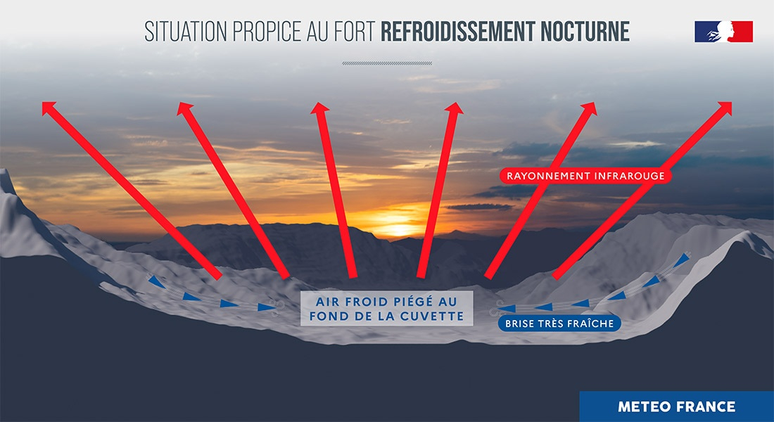 Dans les combes jurassiennes, la brise de pente reste très faible. Avec une déperdition d’énergie maximale, l’air froid est piégé au fond de la cuvette et se refroidit intensément tout au long de la nuit. Schéma de Bruno Vermot-Desroches (Météo-France)