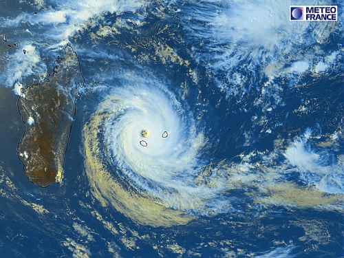 Après avoir parcouru 1 500 km en l’espace de 48 heures entre le 16 et le 18 janvier, le cyclone ralentit son déplacement, sur une trajectoire toujours orientée sud-ouest qui le dirige alors droit vers l’île Rodrigues… Le 20 janvier au matin, Dina est au summum de sa puissance. Classé au stade ultime de cyclone tropical intense, avec une pression centrale de l’ordre de 910 hPa, il génère des vents dont les rafales maximales sont estimées culminer à 300 km/h.