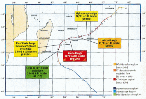 Après son passage au nord de Rodrigues, Dina a perdu légèrement en intensité, mais, revers de la médaille, connu un élargissement du rayon d’action des vents violents présents autour de l’œil (devenu lui-même également plus large). En fin de nuit du 21 au 22, poursuivant une trajectoire ouest-sud-ouest, le centre de Dina passe à un peu moins de 65 km au nord de l’île Maurice. Ce qui signifie que les conditions les plus extrêmes, associées au mur de l’œil, passent à une vingtaine de kilomètres seulement au large. C’est aussi à ce moment-là que les premières pluies conséquentes débutent sur les hauteurs de La Réunion. Après s’être redressée quelques heures vers l’ouest, la trajectoire de Dina change ensuite d’orientation au matin du 22, cette trajectoire devenant extrêmement dangereuse pour La Réunion, puis le cap se stabilise à l’ouest-sud-ouest lors de la phase d’approche finale. L’alerte rouge est décrétée en début de matinée, alors que les conditions se dégradent sensiblement sur l’île.