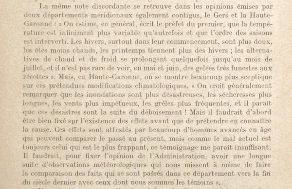 Certaines réponses de départements pourtant limitrophes sont incohérentes. C’est le cas pour le Gers et la Haute-Garonne. Le premier écrit : « On estime, en général, que la température est infiniment plus variable qu'autrefois et que l'ordre des saisons est interverti » alors que le second se montre plus sceptique : « Il faudrait d'abord être bien fixé sur l'existence des effets avant de prétendre en connaître la cause. Ces effets sont attestés par beaucoup d'hommes avancés en âge qui peuvent comparer le passé au présent, mais comme le mal actuel est toujours celui qui est le plus frappant, ce témoignage me paraît insuffisant ».