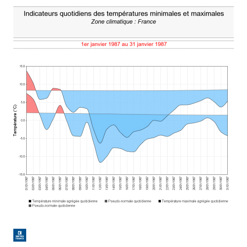 21/01/2022Du 8 au 24 janvier 1987, la France connaissait une sévère vague de froid, qui se place au 3e rang des vagues de froid les plus intenses depuis 1947 (derrière février 1956 et janvier 1985). Ces niveaux de froid n’ont jamais été atteints par la suite et deviennent de moins en moins probables dans le contexte de changement climatique actuel.