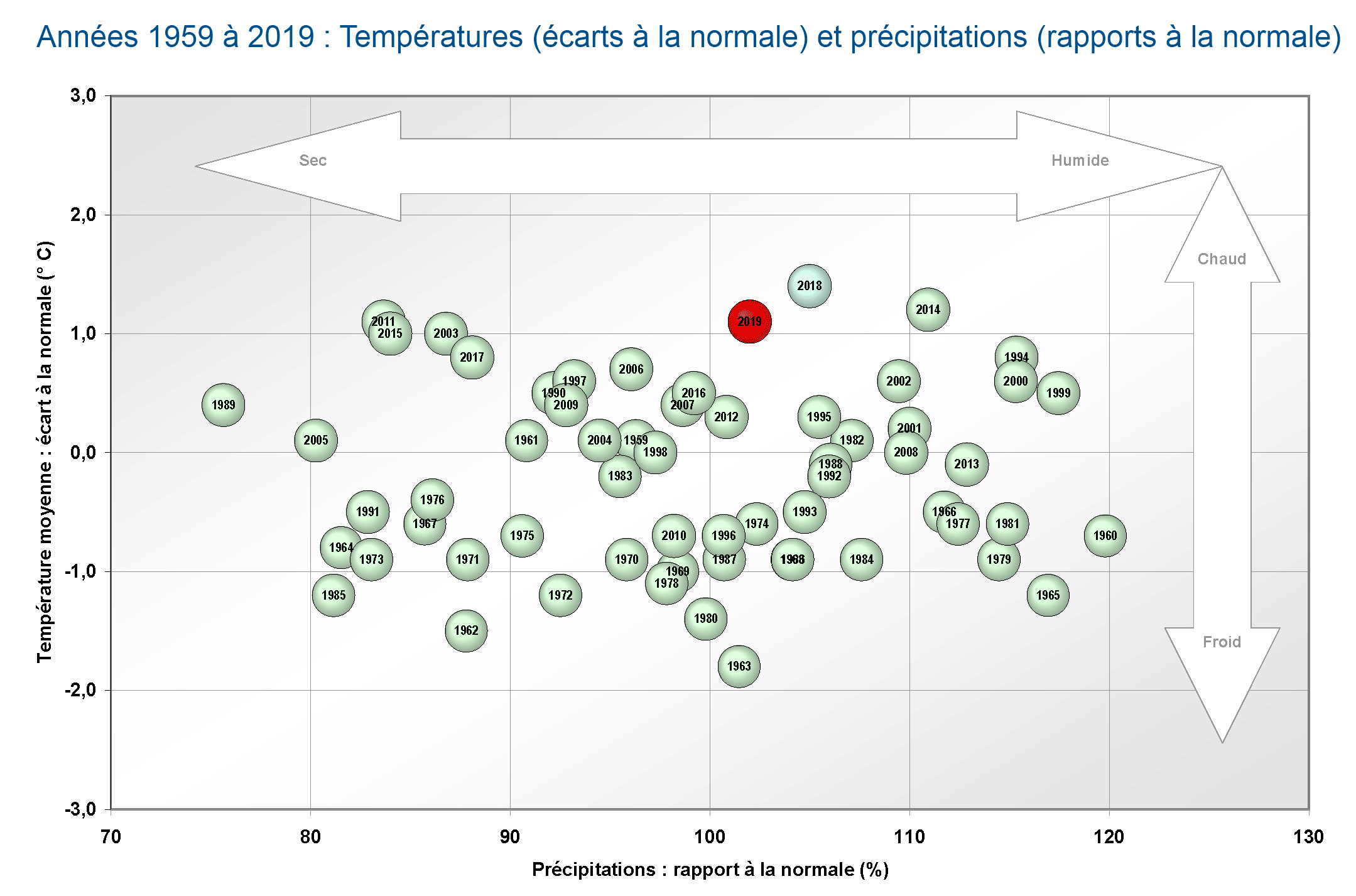 2019 s'est caractérisée par un soleil généreux et la prédominance de la douceur tout au long de l'année avec deux vagues de chaleur d'une intensité exceptionnelle durant l'été. La pluviométrie a été très contrastée. Déficitaire jusqu'à fin septembre, elle a atteint, au dernier trimestre, un excédent proche de 60 % avec des pluies très abondantes sur le sud du pays. De septembre à décembre, les régions méridionales ont été frappées par de violents épisodes méditerranéens accompagnés de pluies intenses qui ont généré des crues et des inondations localement dévastatrices, notamment dans l'Hérault, le Var, les Alpes-Maritimes et la Corse.