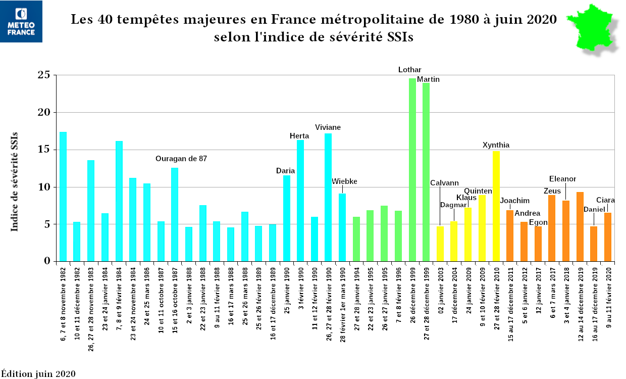 Le nombre de tempêtes dans l’Hexagone et en Corse est très variable d’une année sur l’autre. Pour les années les plus tempétueuses, plus de 15 événements ont touché le territoire, dans les années 1980 (1981, 1984 et 1988) mais aussi plus récemment en 2017, 2019 et 2020, contre 1 à 3 événements par an pour les années les plus calmes (au début des années 2000).