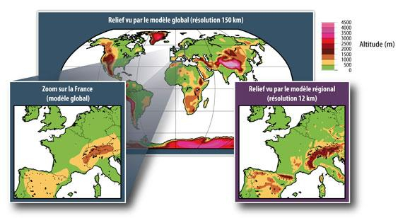 La plupart des modèles qui simulent l’évolution du climat à l'échelle du globe découpent la surface de la Terre en mailles d’environ 150 km de large. Cette résolution est limitée par la puissance de calcul disponible. Mais à cette échelle, il est difficile de prendre en compte les phénomènes météorologiques locaux, comme ceux qui se produisent en montagne ou sur une île dont la taille est inférieure à celle de la maille. Avec une maille de 150 km, le relief des terres émergées n’est pas très détaillé : le Massif central et les Alpes ne forment par exemple qu’un seul bloc, ce qui masque le sillon rhodanien et les phénomènes météorologiques qui s’y produisent, comme le mistral.