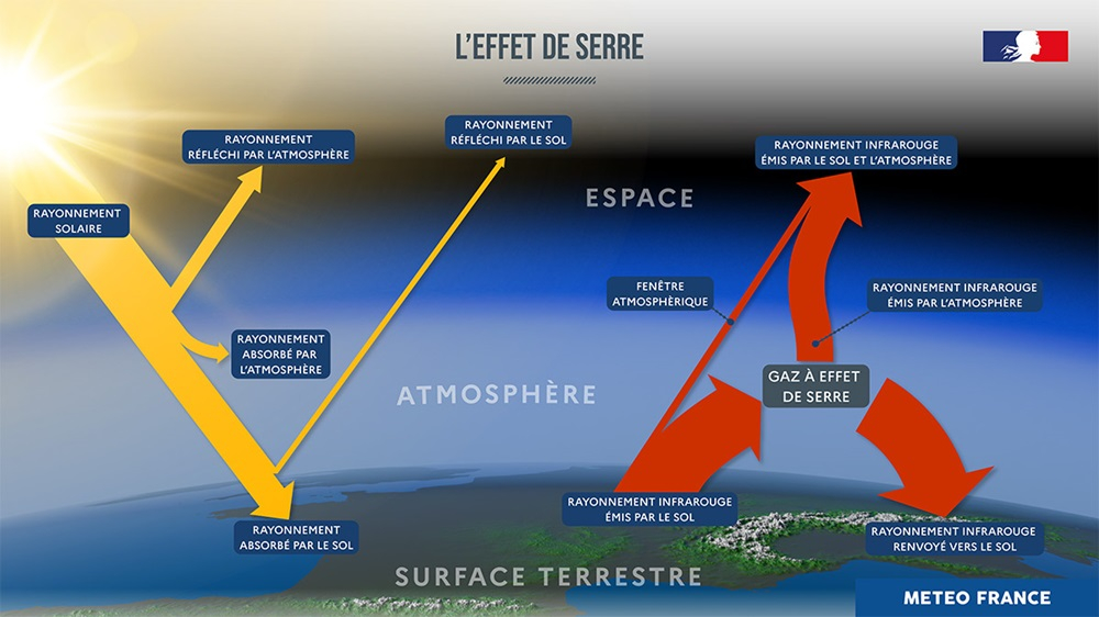 La Terre, de part sa température, rayonne dans l'infrarouge. La majeure partie de son rayonnement infrarouge est absorbée par l'atmosphère, qui contient les gaz à effet de serre. Seule une petite partie est envoyée directement dans l'espace. On parle de fenêtre atmosphérique car dans certaines gammes de longueurs d'onde, l'atmosphère absorbe très peu le rayonnement infrarouge et celui-ci part donc vers l'espace. L'atmosphère rayonne elle aussi dans l'infrarouge. Une partie est dirigée vers l'espace, et une autre vers la surface de la Terre. C'est ce qu'on appelle l'effet de serre.