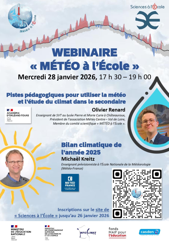 Le mercredi 28 janvier 2026, de 17 h 30 à 19 h 00, « Sciences à l’École » vous invite a un webinaire organisé dans le cadre de l’opération « MÉTÉO à l’École ». Ce webinaire est ouvert aux enseignants du second degré, qu’ils soient membres ou non du réseau « MÉTÉO à l’École », aux étudiants, et à toutes personnes intéressés par la météorologie et la climatologie.