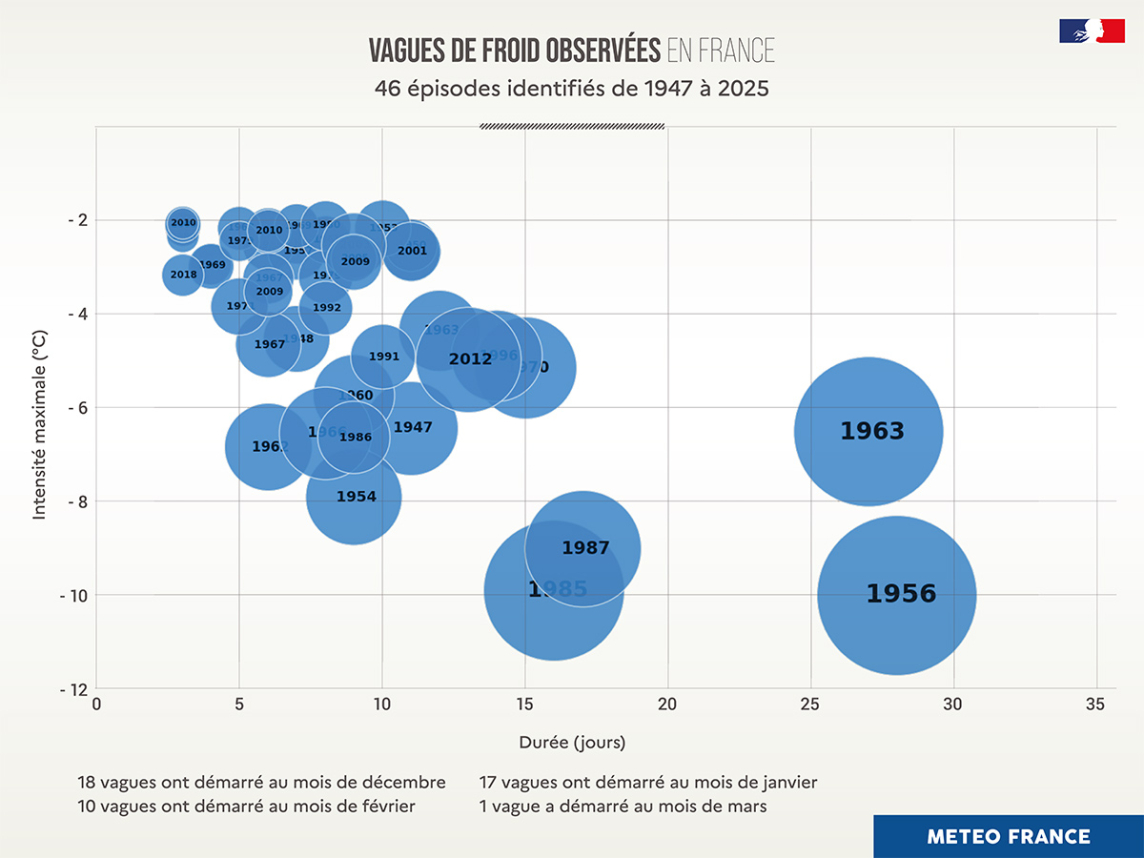 La France a connu 46 vagues de froid depuis 1947 dont seulement 10 depuis le début du 21e siècle. La dernière vague de froid remonte à février 2018. Elle n’avait duré que 3 jours et était de faible intensité.