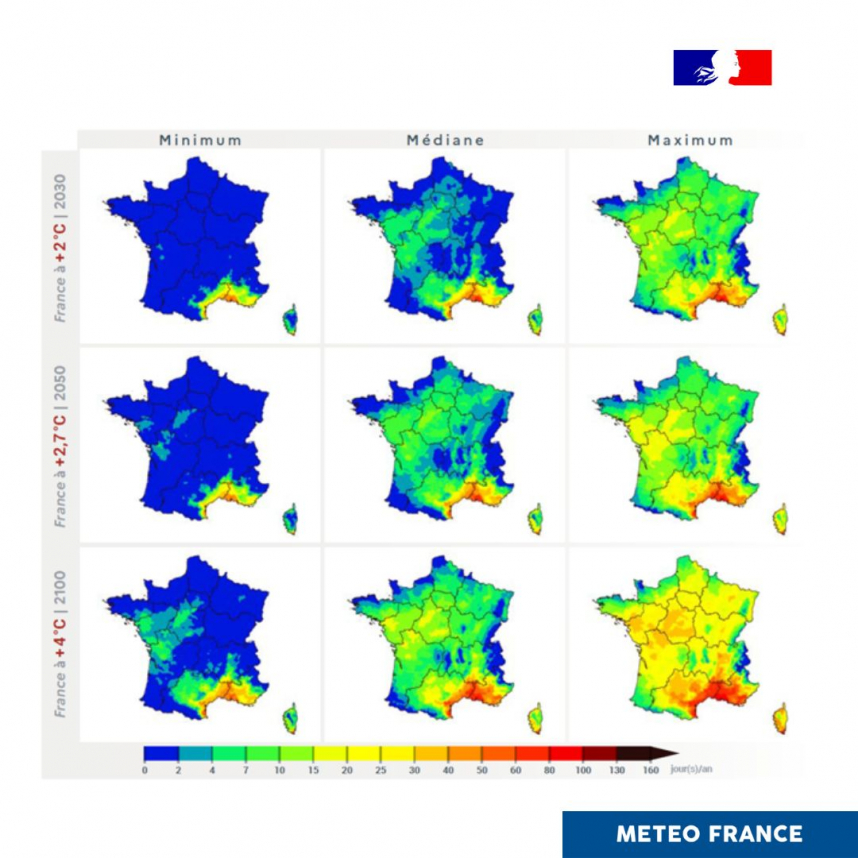 Les projections climatiques indiquent que l'Hexagone pourrait connaître un réchauffement de +2,7 °C d'ici à 2050 et jusqu’à +4 °C en 2100 par rapport à 1900.