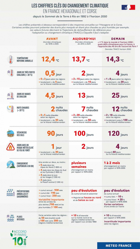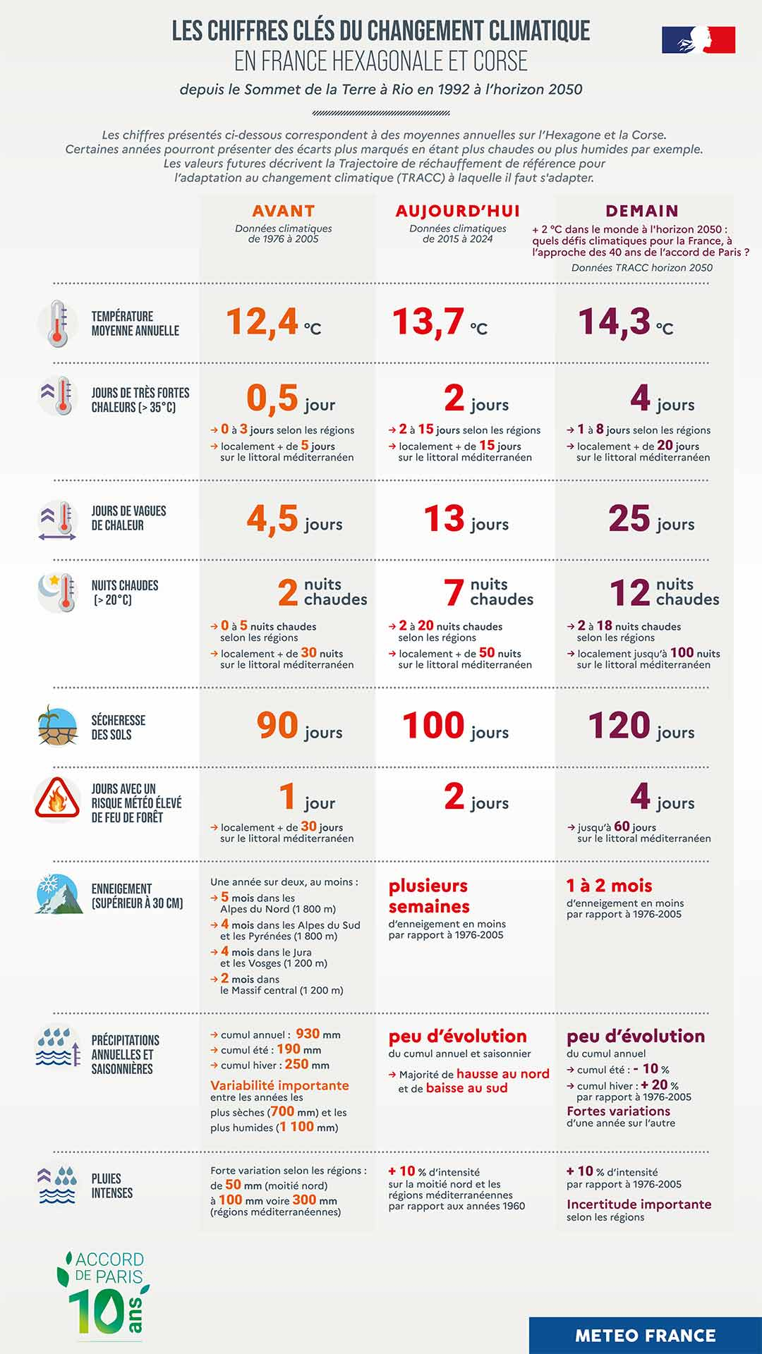 * En moyenne, selon la trajectoire de réchauffement de référence pour l’adaptation au changement climatique (TRACC). Le réchauffement climatique se traduirait en France hexagonale et en Corse par une hausse des températures moyennes de +2,7 °C en 2050 et +4 °C en 2100 par rapport à 1900, avec des impacts sur notre vie quotidienne.