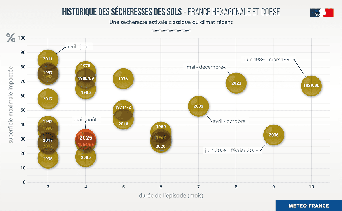 En 2025, un épisode de sécheresse des sols a concerné 30 % de la France de manière durable de mai à août (4 mois). Une proportion plus importante du territoire a été impactée, au moins de manière plus ponctuelle. En moyenne sur la France, cet épisode de sécheresse estivale est classique dans le climat récent.