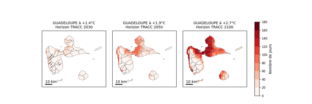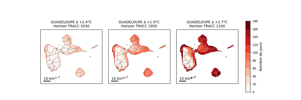 > À l’horizon 2100 de la TRACC (+2,7 °C), la Guadeloupe connaîtrait environ 85 à 90 journées très chaudes par an, avec des valeurs pouvant dépasser 100 jours par an localement. Les journées très chaudes deviendraient fréquentes à très fréquentes, notamment sur la Grande-Terre, les zones littorales Nord et Ouest de la Basse-Terre et de Marie-Galante tandis que les reliefs de la Basse-Terre, bien que relativement moins exposés, ne constitueraient plus un véritable refuge thermique.