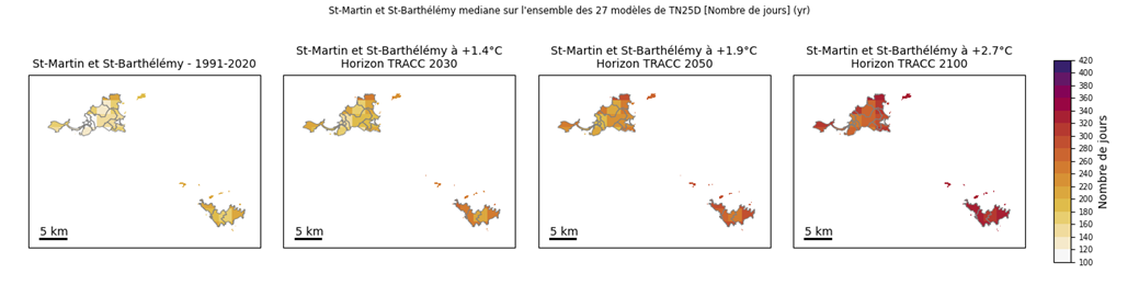 À l’horizon 2100 de la TRACC (+2,7 °C) dans les Îles du Nord (Saint-Martin et Saint-Barthélemy), les nuits chaudes (25 °C ou plus) deviendraient quasi permanentes