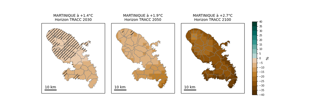 À l’horizon 2100 de la TRACC (+2,7 °C) en Martinique, les périodes sèches seraient plus marquées