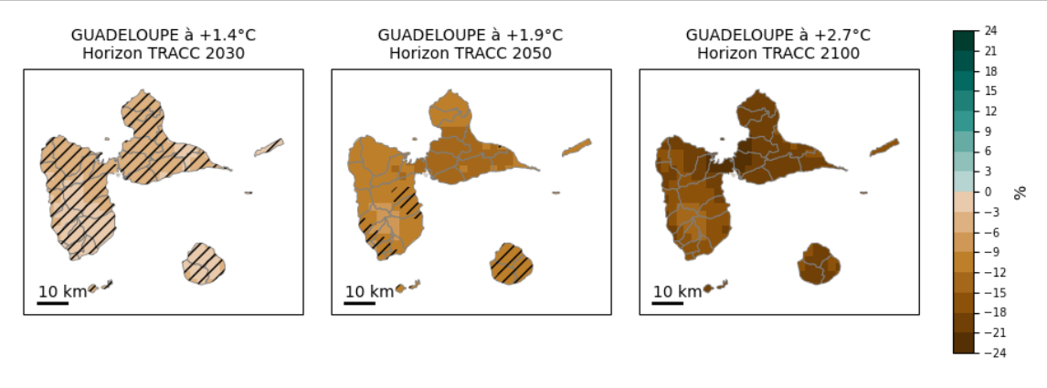 À l’horizon 2100 de la TRACC (+2,7 °C) en Guadeloupe, les précipitations annuelles connaitraient une baisse marquée et généralisée à l’ensemble de l’archipel